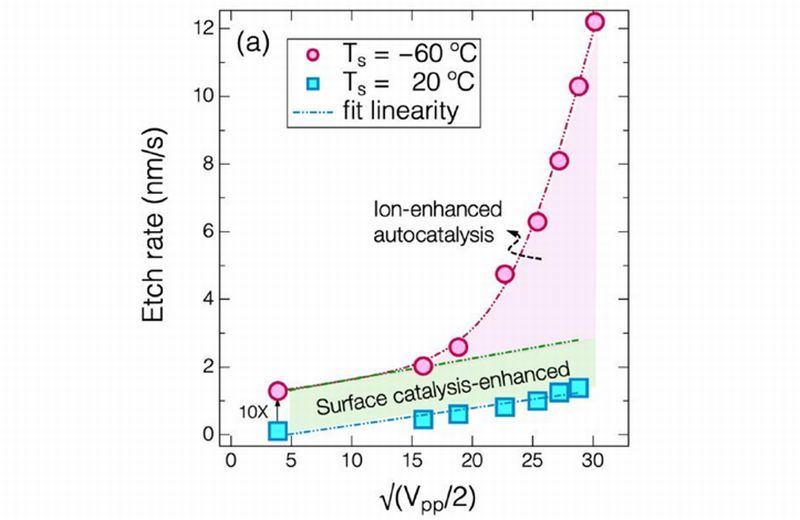 - 나고야대 연구 그룹의 실험 데이터에 따르면, 기존 실온 또는 저이온 에너지 조건과 비교하여 새로운 극저온 반도체 미세공정을 적용했을 때 SiO2 막의 식각 처리량이 약 100배 가량 폭발적으로 향상됨을 입증함.