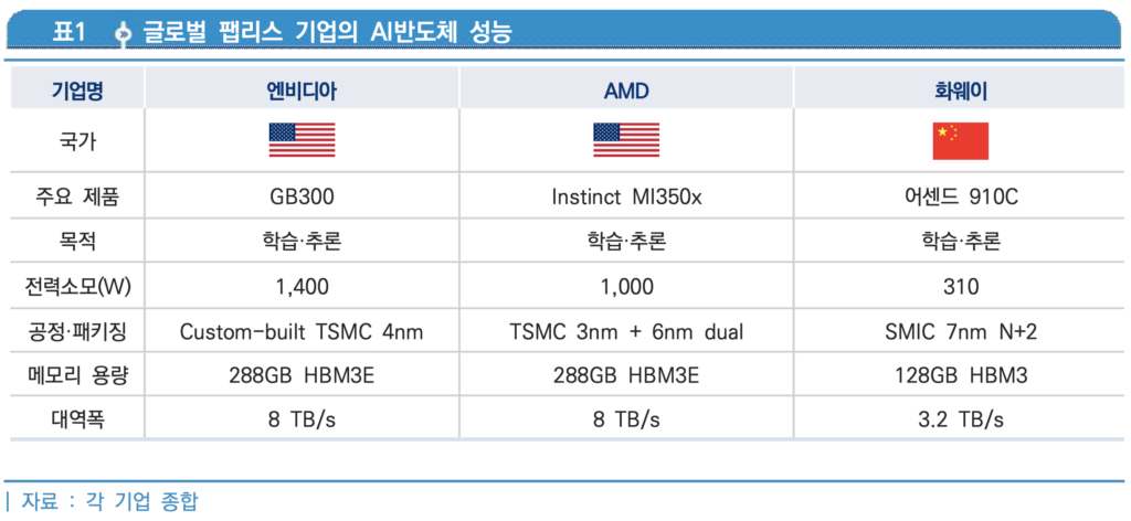 - (AMD) 개방형 SW 생태계인 ROCm과 고용량 메모리 확장성(MI350X)을 무기로 내세우며 비(非)CUDA 생태계의 대안 플랫폼으로 부상하여 AI반도체 주도권 위협