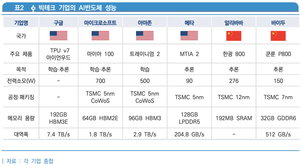 - (구글) HBM 용량과 대역폭을 비약적으로 끌어올린 자체 칩 TPU v7(아이언우드)을 메타, 앤트로픽 등 외부 기업 데이터센터에 직접 판매 및 공급하며 클라우드 AI반도체 주도권 확대